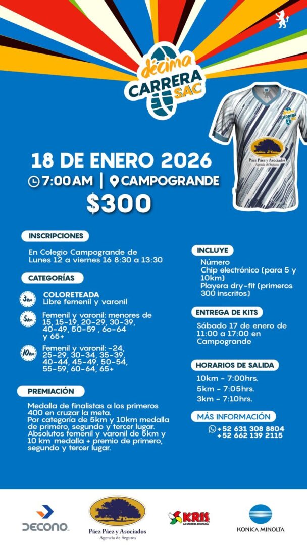 La Sociedad de Alumnos del Colegio Campo Grande, hace la cordial invitación a participar en la 10a. edición de la Carrera SAC 2026. • La carrera se realizará el domingo 18 de enero del 2026. • Salida y meta se ubica en el interior de Colegio Campo Grande. • Hora de salida: 10 km: 7:00 […]