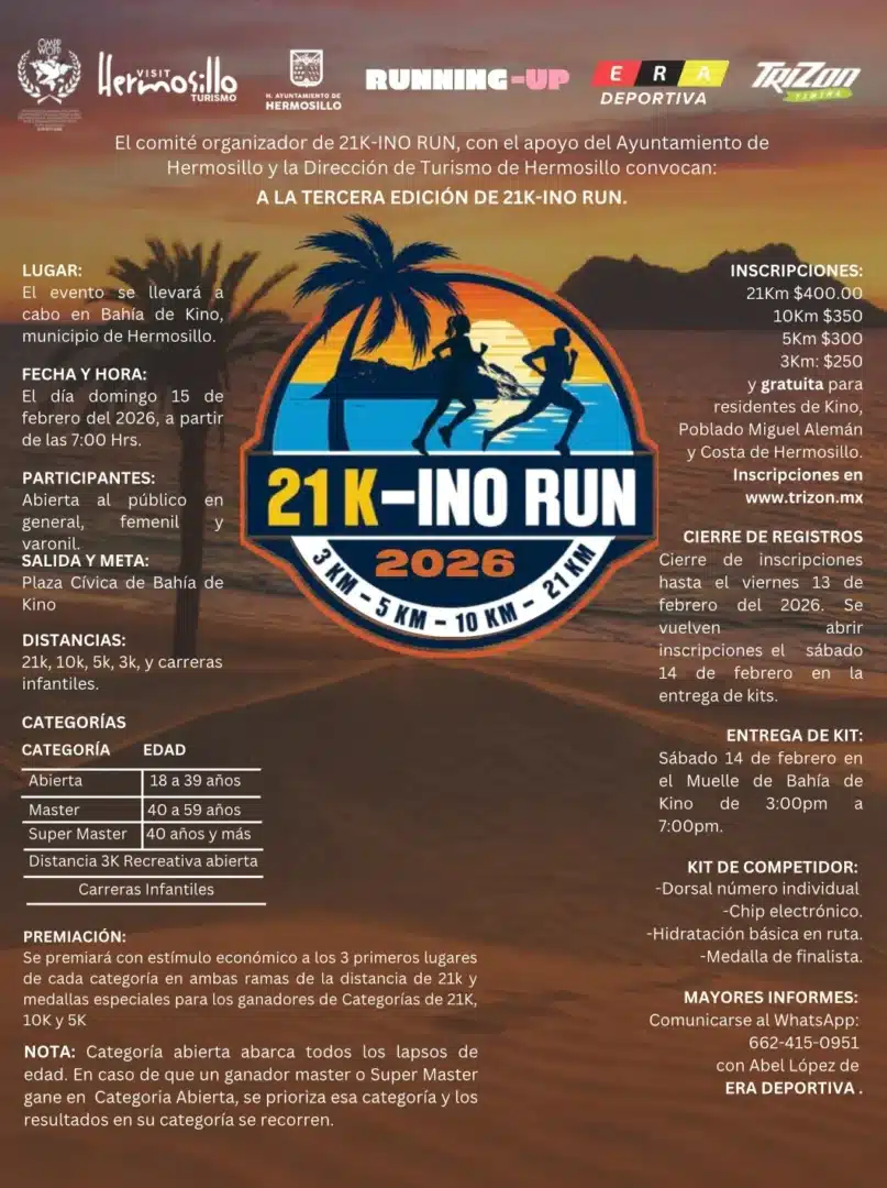 El comité organizador de 21 K-INO RUN, con el apoyo del Ayuntamiento de Hermosillo y la Dirección de Turismo de Hermosillo convocan: A LA TERCERA EDICIÓN DE 21 K-INO RUN